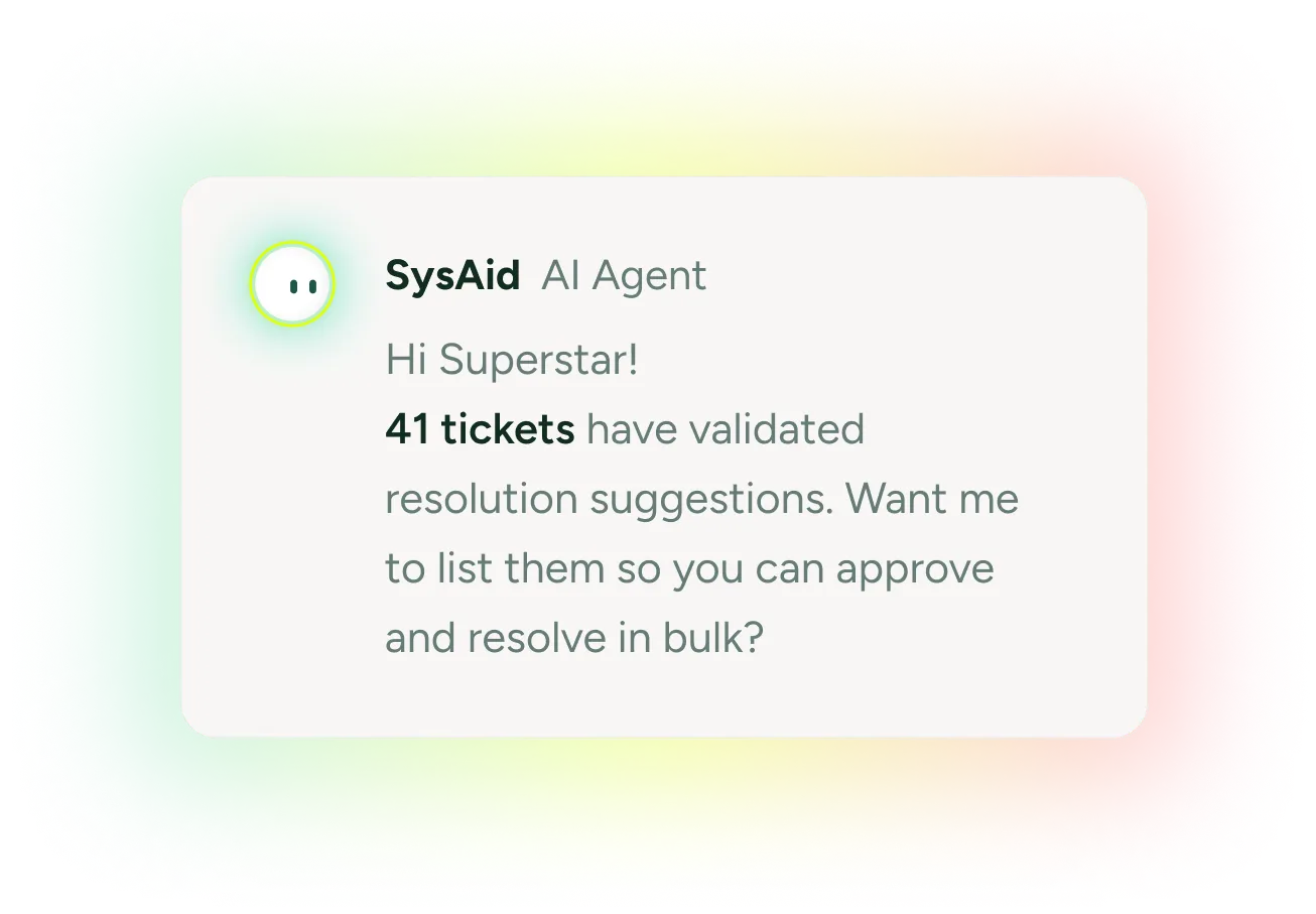 O SysAid é a plataforma completa de Help Desk e ITSM com Inteligência Artificial que automatiza processos, reduz trabalho manual e acelera a entrega de serviços. Ideal para equipes de TI que precisam de eficiência, visibilidade e resultados reais.